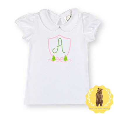 Pink Crest with Christmas Tree Peter Pan Collar Tee | Girls | Short Sleeve | Holiday | Long Sleeve |