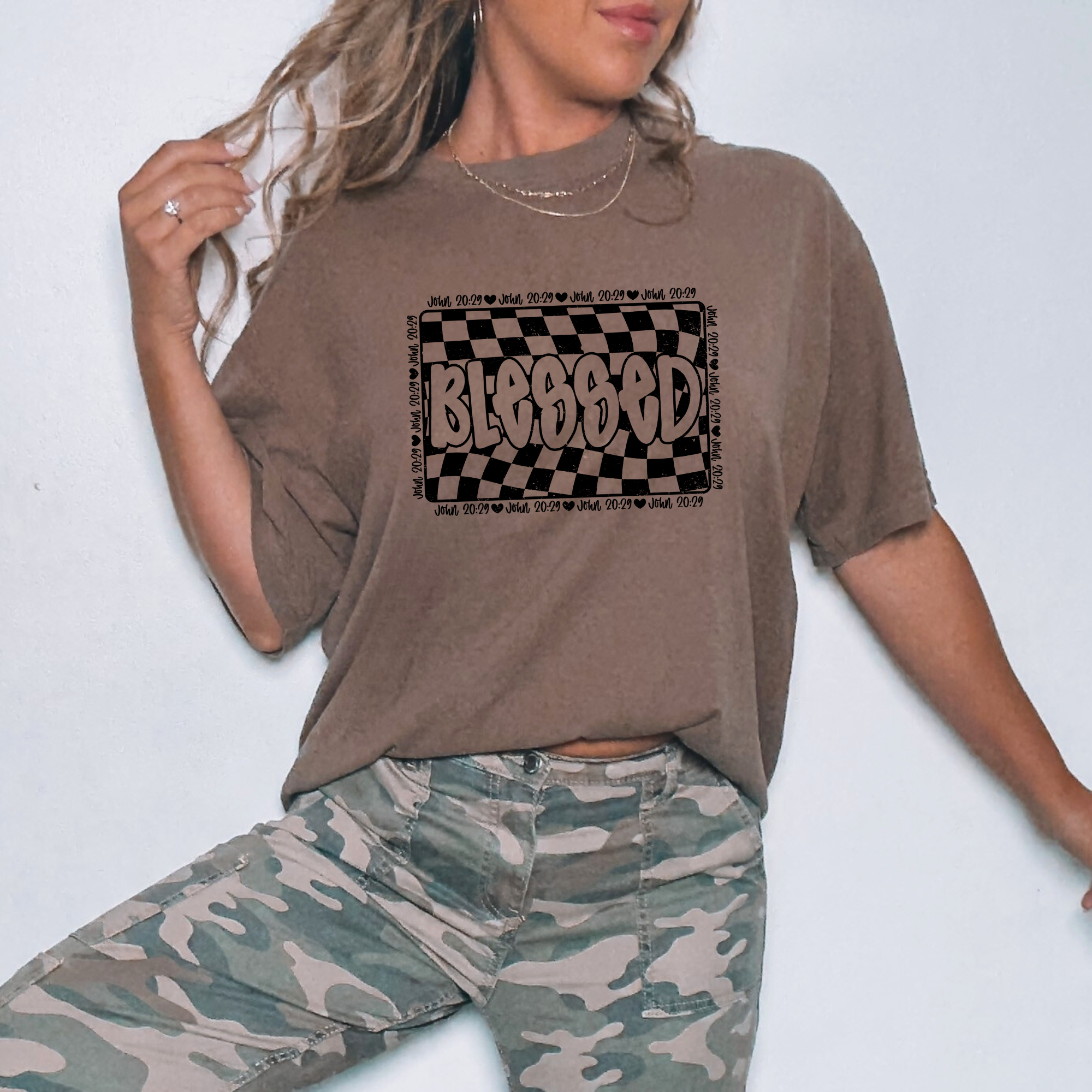 Walk boldly in faith with our “Blessed” Christian Graphic Tee, inspired by John 20:29. Featuring a trendy checkered design with bold lettering, this shirt is a stylish reminder that “Blessed are those who have not seen and yet have believed.”
