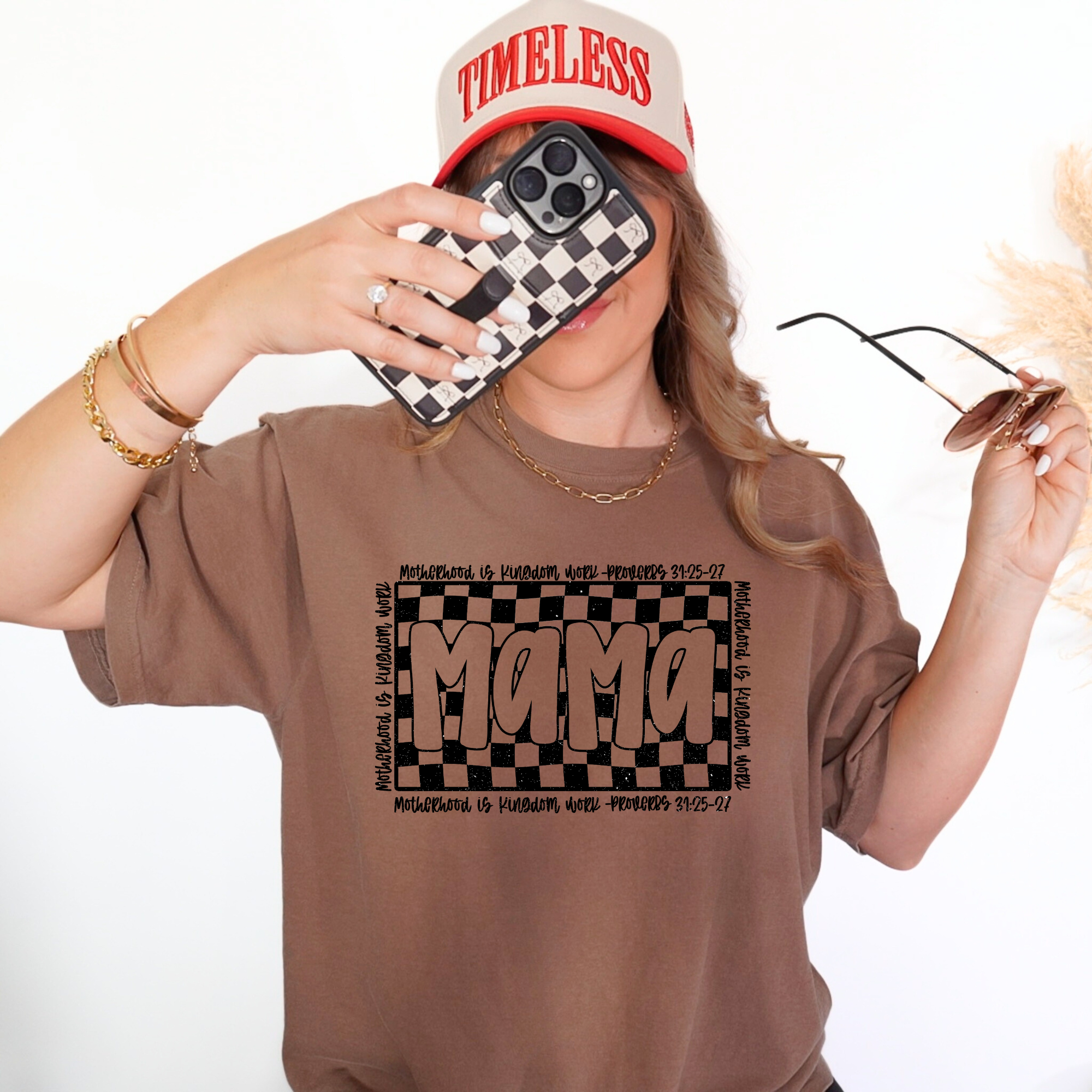 Featuring the word “Mama” framed by a checkered pattern and surrounded by the phrase “Motherhood is Kingdom Work” with Proverbs 31:25–27, this shirt honors the sacred role of motherhood through a modern, boutique-style design.
