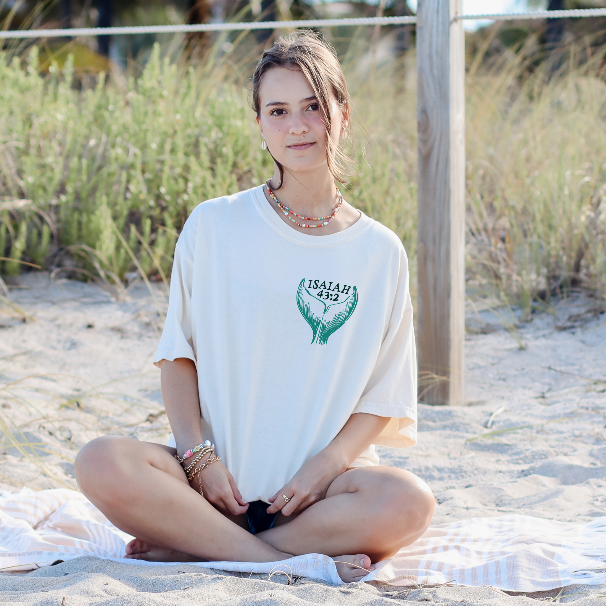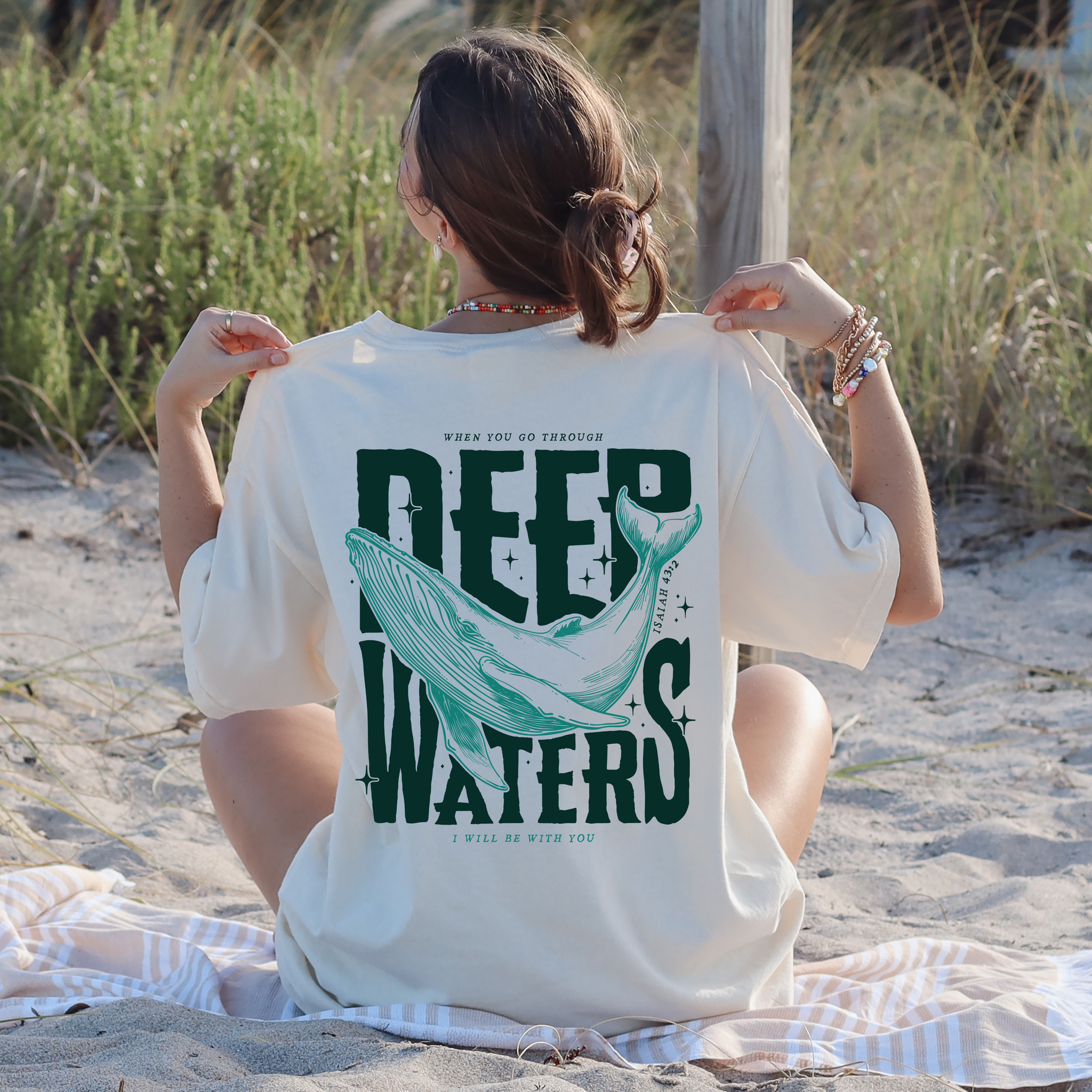 Designed with a soft coastal aesthetic, this shirt features a whale graphic on the back with the words “When you go through deep waters, I will be with you” and a minimal Isaiah 43:2 design on the front. Perfect for everyday wear, beach days, Bible study, or gifting to someone who needs encouragement.